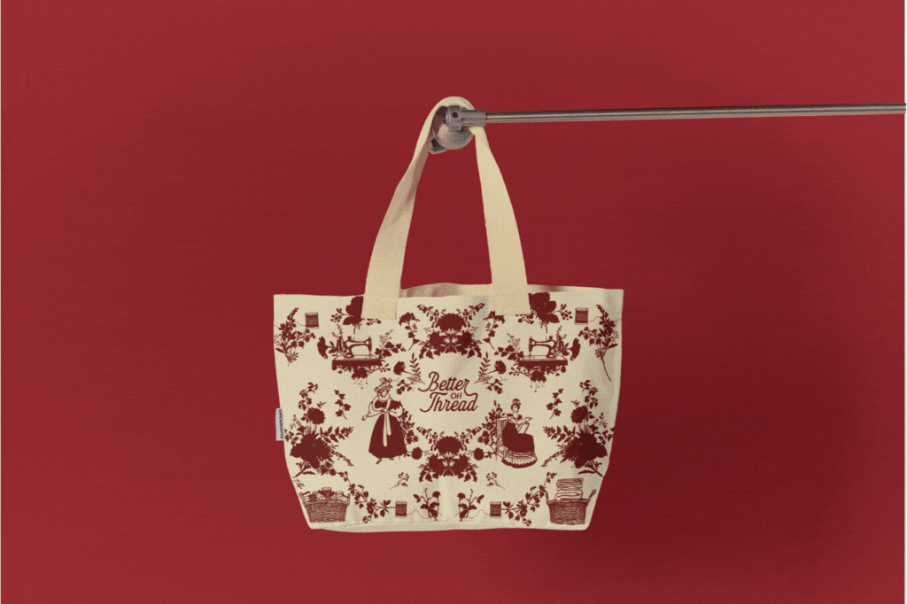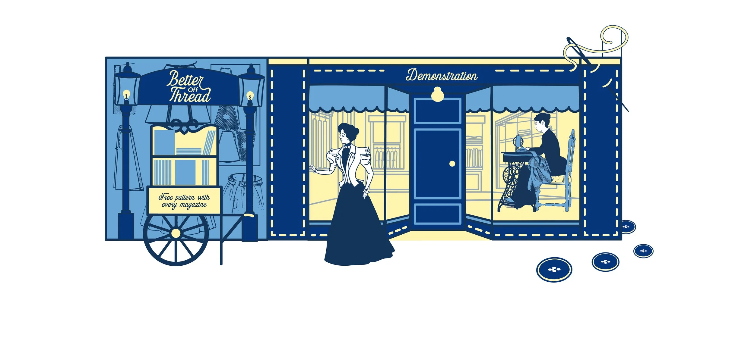 The Better Off Thread pop-up mimics an Edwardian dressmaker’s storefront. It features a mechanical dressmaker sewing the walking skirt, and a magazine stand offering the free pattern with every magazine. All visuals match the magazine’s illustration style, creating a cohesive, on-brand experience that attracts and informs potential readers.